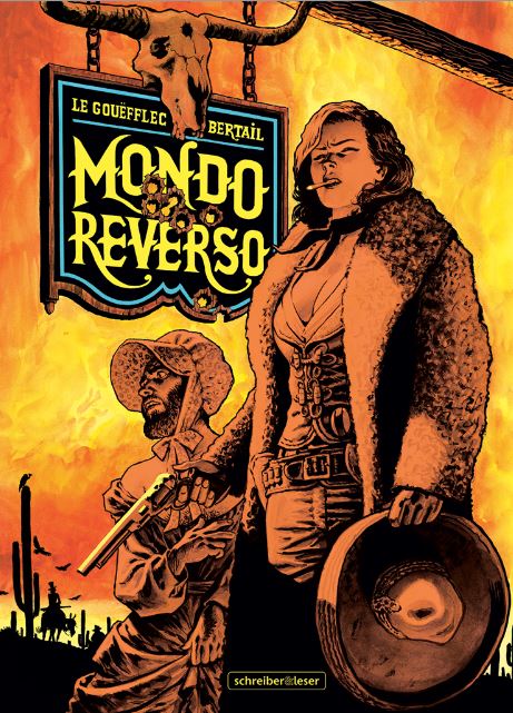 // Darüber hinaus präsentieren wir euch das Werk „Mondo Reverso“, welches schon vom Look her ein echter Hingucker ist. Arnaud Le Gouefflec (Szenario) und Dominique Bertail (Zeichnungen) haben ganze Arbeit geleistet und auch inhaltlich wird man als Western-Fan keineswegs enttäuscht sein. Im Mittelpunkt der Geschichte steht dabei eine Gruppe von Frauen, die im Westen das Heft des Handelns an sich gerissen hat. Die Männer wiederum sind eher dazu da, die üblichen Hausarbeiten zu verrichten und so treffen wir auf eine gewisse Despereda namens Cornelia, die eines Tages dem entlaufenen Hausmann Lindbergh begegnet. Zusammen entschließen sie sich das faszinierende Arizona zu durchqueren und hebeln dabei nicht nur die gängigen Geschlechter-Klischees aus, sondern werden auch immer wieder in Situationen verwickelt, aus denen es sich irgendwie herauszuwinden gilt, ohne dabei unter die Räder zu geraten.